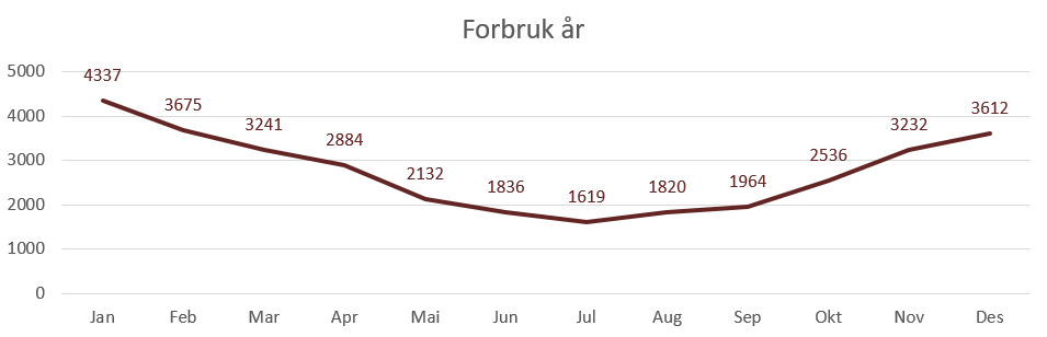 Grafen viser forbruket gjennom året. Her ser ein at forbruket er størst i vintermånadene, med høgaste forbruk i januar, februar, november og desember.